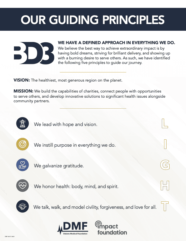 Pictured above: DMF and Impact Foundation’s guiding principles. Each member of our staff has a framed copy, and the board of each organization reviews the principles at least annually. Download a copy below as you develop your organization’s own version.