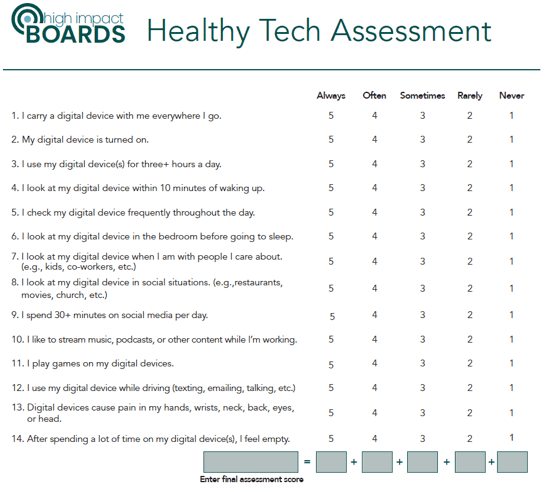 Instructions: Download the Healthy Tech Assessment below, and then use your score to see how healthy (or unhealthy) your tech habits are.